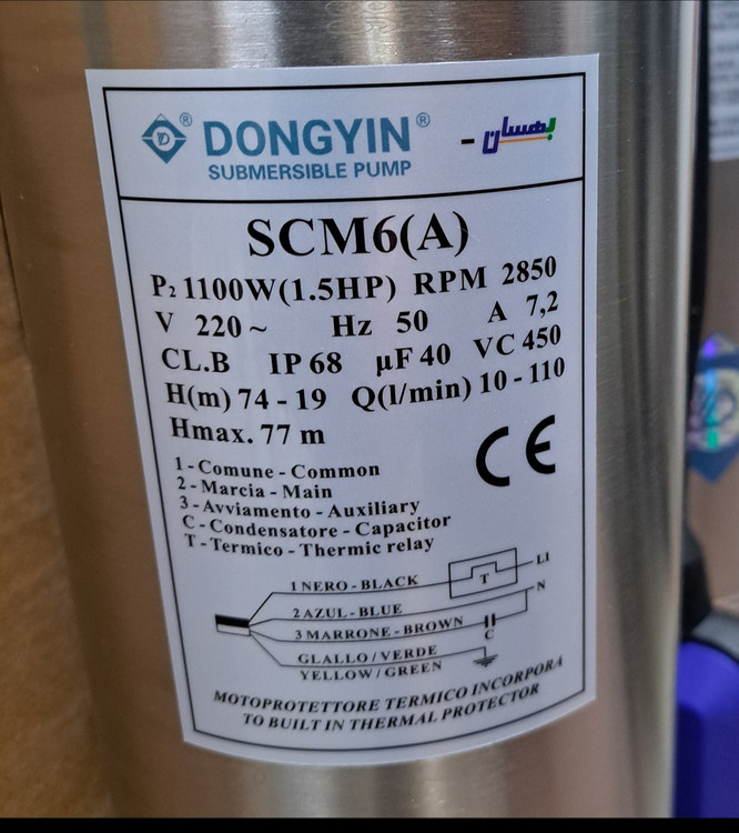 سایز اتصال : 11/4 اینچ حداکثر آبدهی : 110 لیتر بر دقیقه حداکثر هد : 74 متر: توان : 1.1 کیلو وات،تکفاز،فلوتردار،جعبه خازن